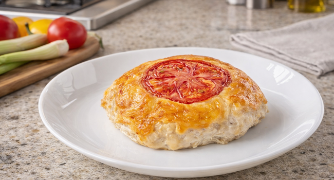 5․ Сверху посыпьте оставшимся сыром и разложите кружочки помидора.