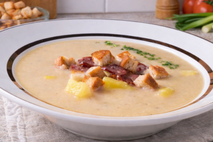 Домашний сырный суп с беконом и запечённым картофелем — это густое, согревающее блюдо с насыщенным сливочным вкусом и аппетитным ароматом.