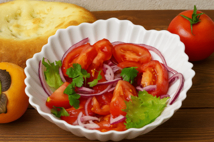 Салат из сочных помидоров к шашлыку — это лёгкое, освежающее дополнение к жареному мясу, которое подчёркивает его вкус и придаёт блюду баланс.